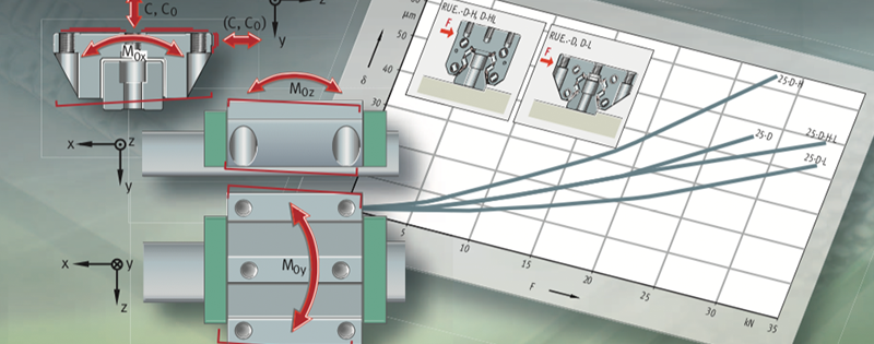 The size of a monorail guidance system is determined by the demands made on its load carrying capacity, rating life and operational security. The load carrying capacity is described in terms of the basic dynamic load rating C, the basic static load rating C0 and the static moment ratings M0x, M0y and M0z, Figure 1. The calculation of the basic dynamic and static load ratings given in the dimension tables is based on DIN 636-1 and 2.